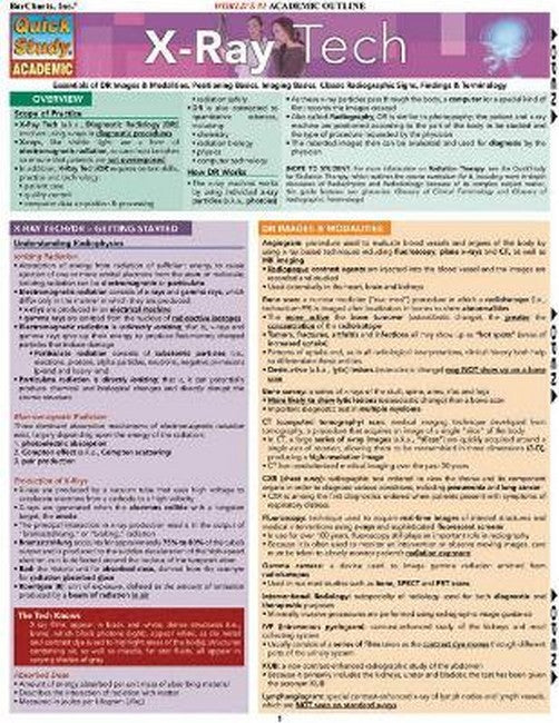 X-ray tech/diagnostic radiology (DR) is tried-and-true healthcare modality, yet ever-changing technology makes it a continually challenging field. Our comprehensive 3-panel (6-page) guide will make it all easy to understand, including the differences between DR and radiation therapy (RT). All key aspects of DR -- from basic radiophysics to diagnostic testing procedures -- are covered in-depth with up-to-date information, enhanced by useful charts and tables. Each section features "The Tech Knows" summary of critical points, set off graphically for easy reference.