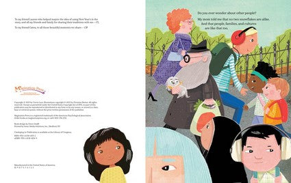 Carrie Lara, PsyD, is a licensed clinical psychologist who has worked with a range of clients, from children and families to adults with severe mental illness. She is an award-winning children's book author whose books include the award winning Marvelous Maravilloso, The Heart of Mi Familia, and Out of the Fires. She lives in Sonoma County, CA with her family. Visit carriealara.com and @AuthorCarrieLara on Facebook and Instagram. Christine Battuz has illustrated over 60 children's books, including Marvelous Maravilloso, The Heart of Mi Familia, My Sister Beth's Pink Birthday, and Shy Spaghetti and Excited Eggs. Her work appears in educational books, magazines, toys, and toy packaging. She teaches art to adults and children of all ages. She lives in Bromont, Quebec. Visit her at mbArtists.com and illustrationquebec.com.